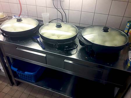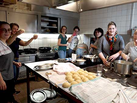 Bereits am Vorabend hat ein "Suppenteam" mit großem Einsatz riesige Mengen Suppe zubereitet. Samstagsmorgens um 5.30 Uhr ging es dann los mit der Teigzubereitung. 40 kg Mehl wurden verarbeitet, rund 600 Dampfnudeln gerollt, Soßen gekocht, Tische vorbereitet usw. Alle mussten kräftig hinlangen, denn ab 11.15 Uhr konnte man bereits vorbestellte Portionen abholen, um 11.30 Uhr eine weitere Runde. Schon bald trudelten die ersten Gäste ein. Dieses Jahr konnte jeder Hunger gestillt werden, alle wurden zeitnah und gut versorgt.