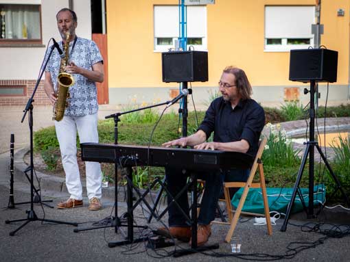 auf den Gehwegen und Straßen, den Klängen von Klarinette, Saxophon und Keyboard.