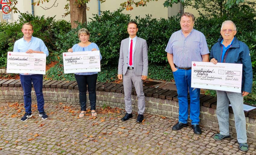 Stephan Jäger als Vertreter der Sparkasse übergab eine Spende in Höhe von insgesamt 1.200 Euro an Stefan Müller vom Musikverein "Bienwaldkapelle", Bettina Brossart vom TTC Büchelberg und Eugen Niederer und Edgar Albrecht vom Obst- und Gartenbauverein Büchelberg. Diese finanzielle Unterstützung wird für dringende Anschaffungen und den laufenden Trainingsbetrieb verwendet. Insgesamt spendete die Sparkasse im Rahmen dieser Aktion 55.000 Euro an 150 Vereine.