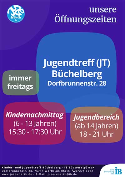 Der Jugendtreff Büchelberg wird künftig Freitags von 17 bis 21 Uhr für alle Jugendlichen ab 14 Jahre geöffnet sein. Kooperationspartner sind der Ortsbezirk Büchelberg, die Stadt Wörth am Rhein und der Internationale Bund. Dabei ist Eigeninitiative und ehrenamtliche Mitarbeit willkommen und erwünscht: Wer sich engagieren möchte, darf sich unter 07271-8622 beim IB Jugendzentrum Wörth melden.