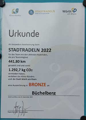 Das Team Büchelberg hat beim Stadtradeln 2022 innerhalb der Stadt Wörth den dritten Platz, also Bronze, bei den gefahrenen km pro Teilnehmer, gewonnen.