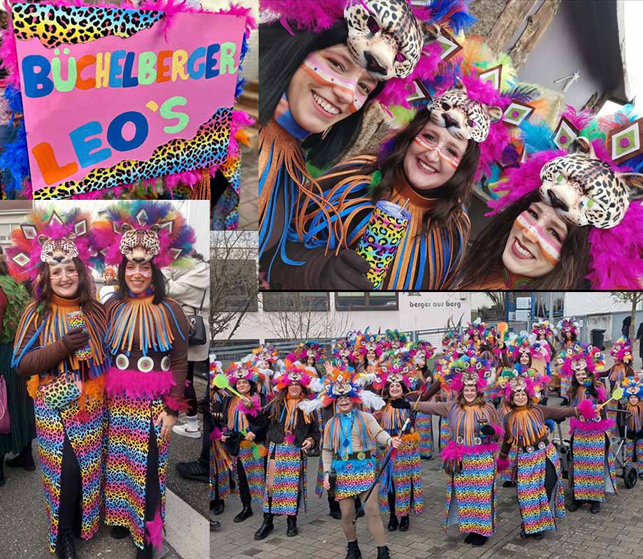 Auch in diesem Jahr hatten sich die „Büchelberger Fasebuzze“ wieder ein tolles Motto für die Fasenachtskampagne ausgedacht. Nach wochenlanger Arbeit und vielen Abenden beim Nähen und Basteln im Juze waren die Kostüme fertig.....und es hat sich wirklich gelohnt. Mit dem außergewöhnlichen, aufwendigen und farbenfrohen Kostüm verwandelten sie sich in die „Büchelberger Leo's“. Die „Büchelberger Leo's“ waren bei den Umzügen in Lauterbourg, Maximiliansau, Berg, Rheinsheim und Hagenbach ein echter Hingucker und Samstags zogen sie auch durch Büchelberg. Mit ihren bunten Kostümen und jeder Menge guter Laune tanzten und sangen sie auf Straßen und verbreiteten eine tolle Stimmung. Für ihre Auftritt erhielten sie viel Lob und Zuspruch.